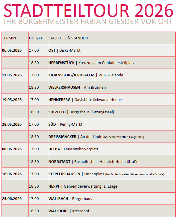 Im Rahmen seiner diesjährigen Stadt- und Ortsteiltour pflegt Bürgermeister Fabian Giesder erneut den direkten Kontakt mit den Bürgerinnen und Bürgern. Ziel der Tour ist es, vor Ort Anliegen aufzunehmen und gemeinsam Lösungen für anstehende Herausforderungen zu finden . Die traditionelle Frühsommertour beginnt am 6. Mai 2026 am Diska-Parkplatz in der Drachenbergstraße. Insgesamt wird der Bürgermeister zu 14 Terminen in den Stadt- und Ortsteilen anzutreffen sein. Bürgerinnen und Bürger haben dabei die Gelegenheit, direkt ins Gespräch zu kommen und ihre konkreten Anliegen vorzutragen. „Ich freue mich auf den persönlichen und konstruktiven Austausch mit den Menschen unserer Stadt“, so das Stadtoberhaupt im Vorfeld der Tour.